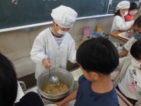 今日は、「こぎつねごはん」という名前の、甘辛く煮た油揚げと鶏肉、野菜が入ったまぜご飯でした。「わあ、おいしい~。」「何が入っているの?」「ちょっと甘くて大好きな味~。」など、新しいメニューに大喜びの子供たちでした。おかわりをした子もたくさんいました。