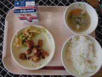 4月20日(水)の給食は、愛媛県の味めぐりでした。「しょうゆめし」「魚そうめん汁」「豚肉のみかんソース」はどれもおいしく、みんなうれしそうに食べていました。