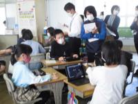3年生は体育の時間、体育館でマット運動を頑張っていました。挑戦している技は、「側方支持回転」(略して側転という技)。タブレットも活用しながら、友達の技のいいところを紹介し合っていました。