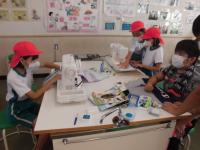 家庭科の時間、6年生はナップザックを作っています。ミシンの糸の通し方を忘れた子供は、パソコンで調べながら調整していました。去年エプロンを縫ったので、慣れた子供はどんどん縫い進めていました。
