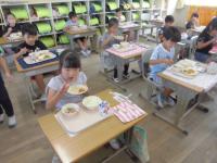 10月15日(金)の給食は、「黒糖パン」と「中華そば」でした。「えびのから揚げ」や「ナムル」もあり、子供たちは大喜び。今日も、おいしそうに食べていました。