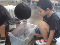 音の学習のために作った糸電話・・・家に持ち帰る前に、もう一度使って音の伝わりを確認しました。糸をつまんだり、3組が糸を絡ませて声が伝わるか試したり・・・といろいろな方法で楽しみました。声が届くって、本当におもしろい!振動で音を感じるって、ワクワクする感覚です。