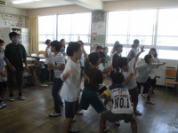 3年生の体育科のボール運動では、フロアバレーボールをしています。60~70㎝の高さで固定した紐と床の間を、ボールを打ち合って得点を獲得するゲームです。チームの友達に声を掛けながらボールをパスしたり、作戦タイムには動きの確認をしたりして、子供たちは終始、意欲的に活動をしていました。次はトーナメント制で対戦するそうです。どのチームが1位になるのか、楽しみです。