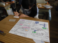 6年生の理科です。天秤を使い、実際におもりの釣り合いを確認しながら、おもりの重さと支点からの距離の関係式を探っていきました。グループによって、吊るすおもりの数も支点からの距離も異なります。その面白さや規則性を見つけ、意欲的に学習に取り組んでいました。